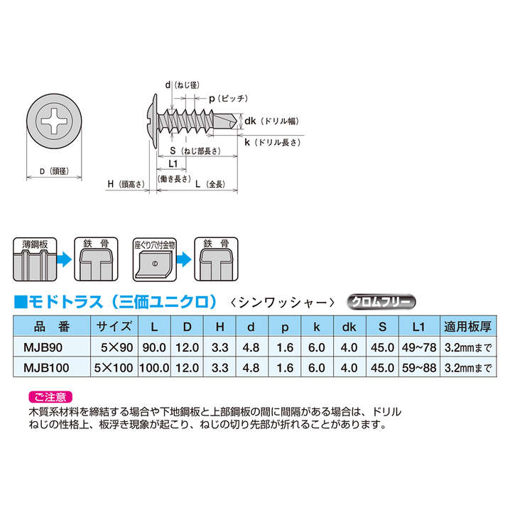 ●薄鋼板+鉄骨用ドリルビス 座ぐり穴付金物+鉄骨用ドリルビス
