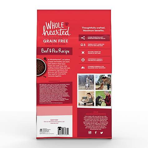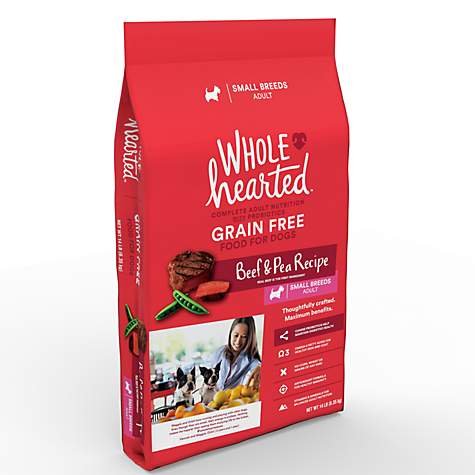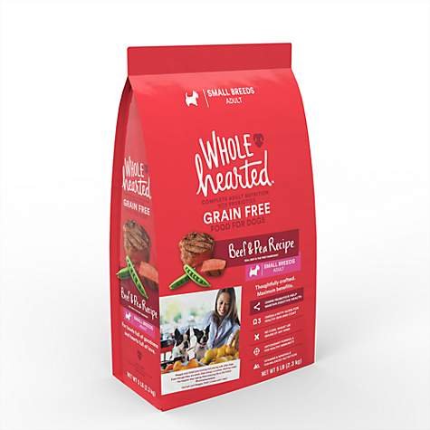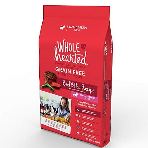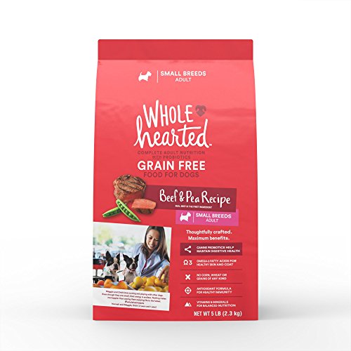 -. Binding : Misc. -. Brand : WholeHearted -. Feature : Grain Free, Adult Small Breed Recipe Dry Dog Food from WholeHearted / Real beef is the first ingredient / Canine probiotics help maintain digestive health / Omega-3 fatty acids for healthy skin and coat / No corn, wheat, or grains of any kind -. Label : WholeHearted -. Manufacturer : WholeHearted -. PackageQuantity : 1 -. ProductGroup : Pet Products -. ProductTypeName : PET_SUPPLIES -. Publisher : WholeHearted -. Studio : WholeHearted -. Title : WholeHearted Grain Free Small Breed Adult Beef and Pea Recipe Dry Dog Food