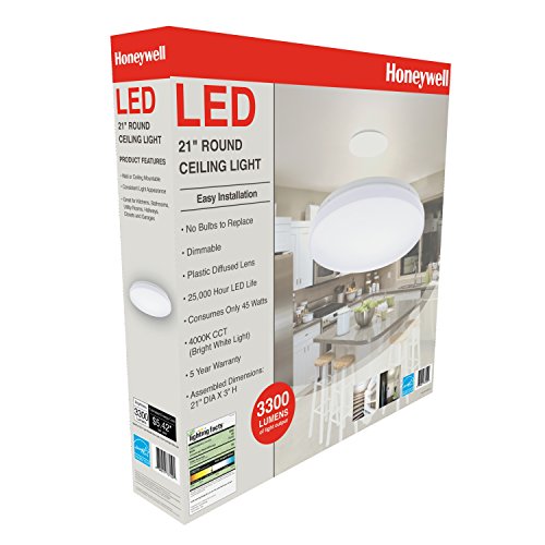 The Honeywell LED 21 inch round ceiling lights allows you to light up your surroundings in an efficient, cost effective way. This LED 21 inch round ceiling light features solid construction all in a stylish decorative lighting fixture which delivers evenly distributed light. Producing 3300 lumens at 45 watts, the LED 21 inch round ceiling light is the right choice for reducing your annual energy costs while improving your existing lighting output.Feature