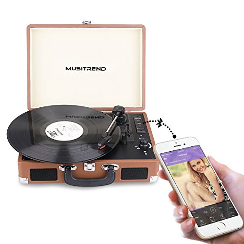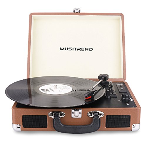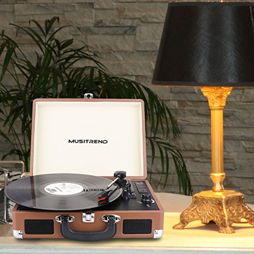 Musitrend Bluetooth Record Player Portable Suitcase Turntable with Built-in Speakers, USB/SD Recorder, Rechargable battery, Headphone Jack, RCA line out, Brown