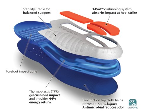 -. Feature : Stability cradle for balanced support / 3-POD cushioning system / Low friction top cloth / Forefoot impact zone / TPR gel cushions impact and provides 44% energy return