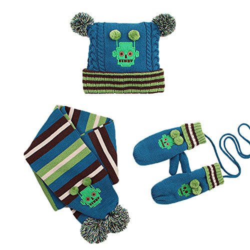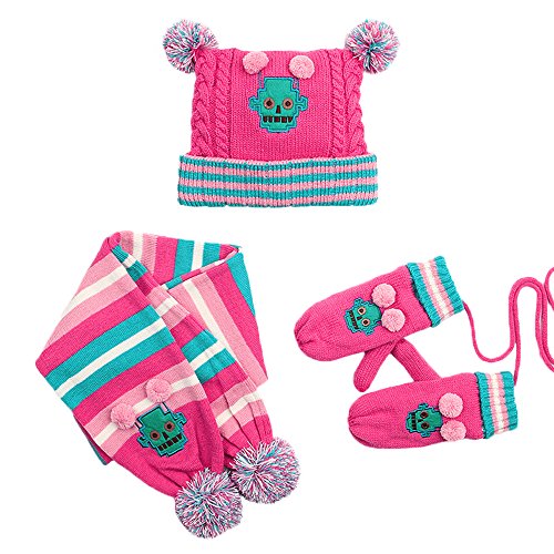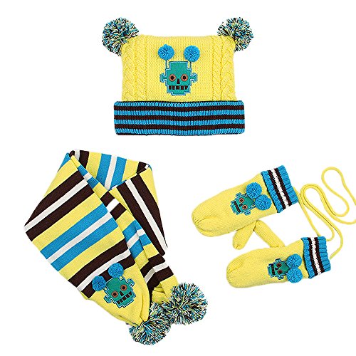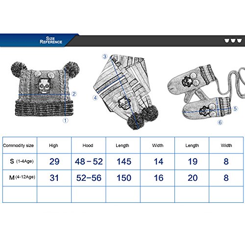 High-quality knitting yarn, let your baby feel comfortable. Great gift idea for friends, family, and your little boys and girls This matching hat scarf and gloves set makes a wonderful gift set. Each set comes with 1 Pompom beanie, 1 pair of mittens, 1 scarf Makes the perfect gift for Thanksgiving, Christmas, New Year or any occasion Excellent all-inclusive fall/winter accessory set to keep you warm during the cold days 3-piece set includes cable knit fleece lined beanie hat with a matching scarf and gloves Lovely 3 piece matching set in multiple solid colors to match any of your Children's winter outfits [ Size Chart (Inch) For Yellow] S Recommend 1-4(years): Hat 48"-52" Diameter x 29" H, Scarf 145" L x 14" W, Gloves 19" L x 8" W M Recommend 4-12(years): Hat 52"-56" Diameter x 31" H, Scarf 150" L x 16" W, Gloves 20" L x 8" W [ Size Chart (Inch) For Rose Red] S Recommend 1-4(years): Hat 48"-52" Diameter x 29" H, Scarf 145" L x 14" W, Gloves 19" L x 8" W M Recommend 4-12(years): Hat 52"-56" Diameter x 31" H, Scarf 150" L x 16" W, Gloves 20" L x 8" W [ Size Chart (Inch) For Blue] S Recommend 1-4(years): Hat 48"-52" Diameter x 29" H, Scarf 145" L x 14" W, Gloves 19" L x 8" W M Recommend 4-12(years): Hat 52"-56" Diameter x 31" H, Scarf 150" L x 16" W, Gloves 20" L x 8" W [Package Included] 1 x Pompom beanie 1 x Pair of mittens 1 x Scarf [Note] Size mearsured by ourselves,sometimes has some errors,but always within 3cm (All measurement in cm and please note 1cm=0.39inch). Due to some reason,there are some color difference,please kindly understand us,thank you and wish you happy shopping!