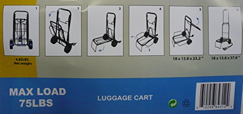 Product DescriptionNew Durable and Sturdy Folding Luggage Cart Handle Height: 38" - Cart Width: 14.50" Wide Folds Flat and small into 22" x 11" for Storage Max load 75 lbs. Weight: 4.85 lbs.0