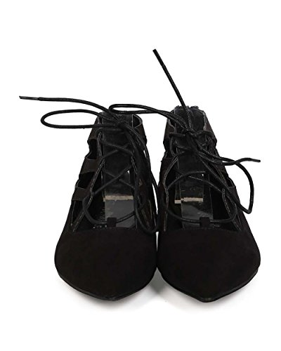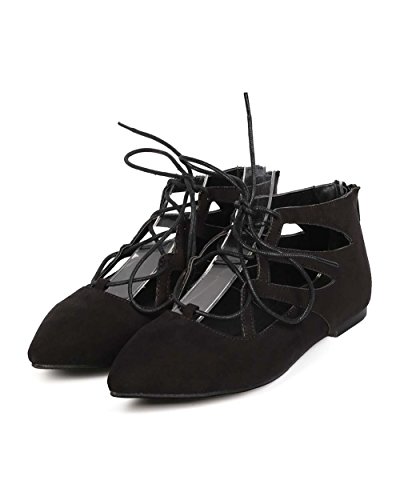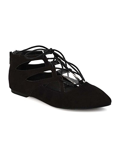 Nature Breeze EG21 Women Suede Pointy Toe Zipper Lace Up Flat - Black