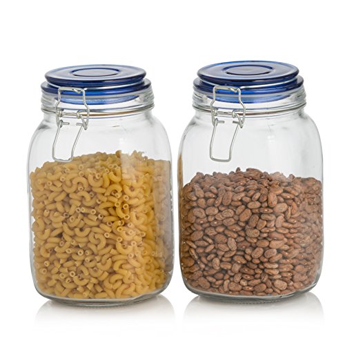 - CANISTER SIZES: This 2-piece set of glass air-tight kitchen storage jars with blue lids includes: two large 48oz jars - measures approximately 4.5-inch in diameter and 8-inch in height.