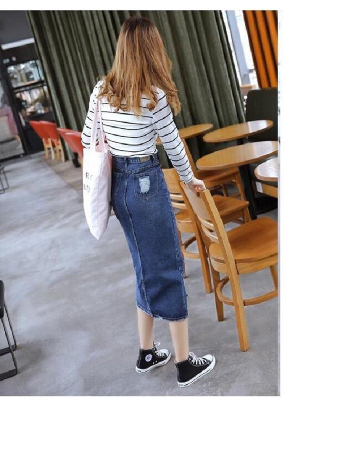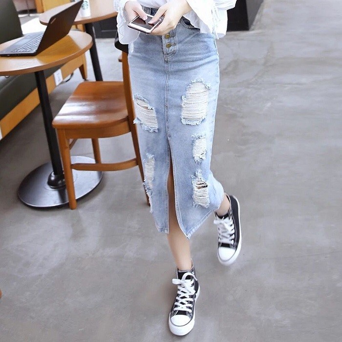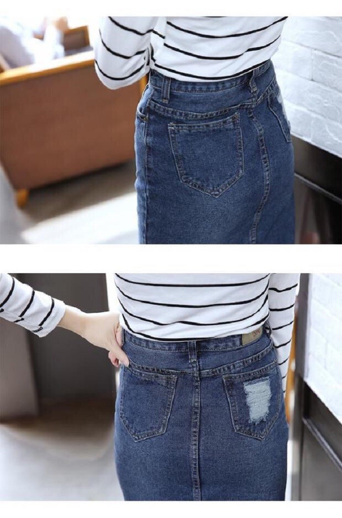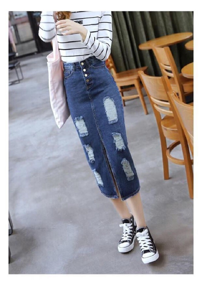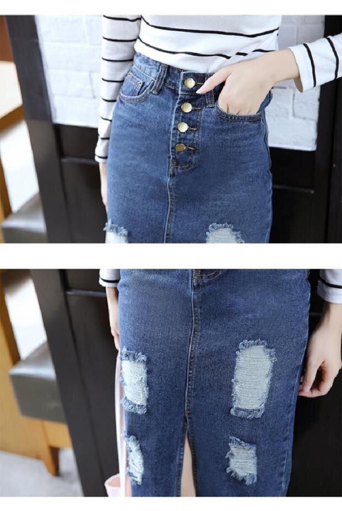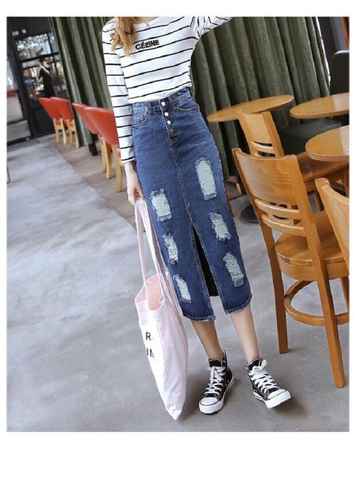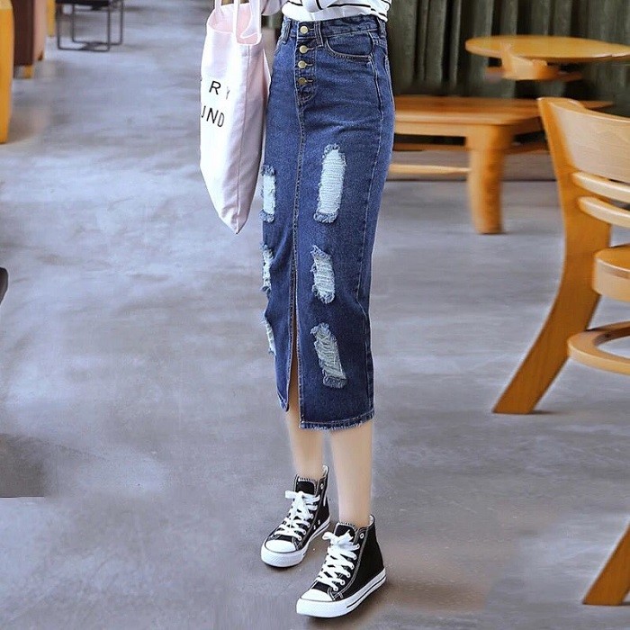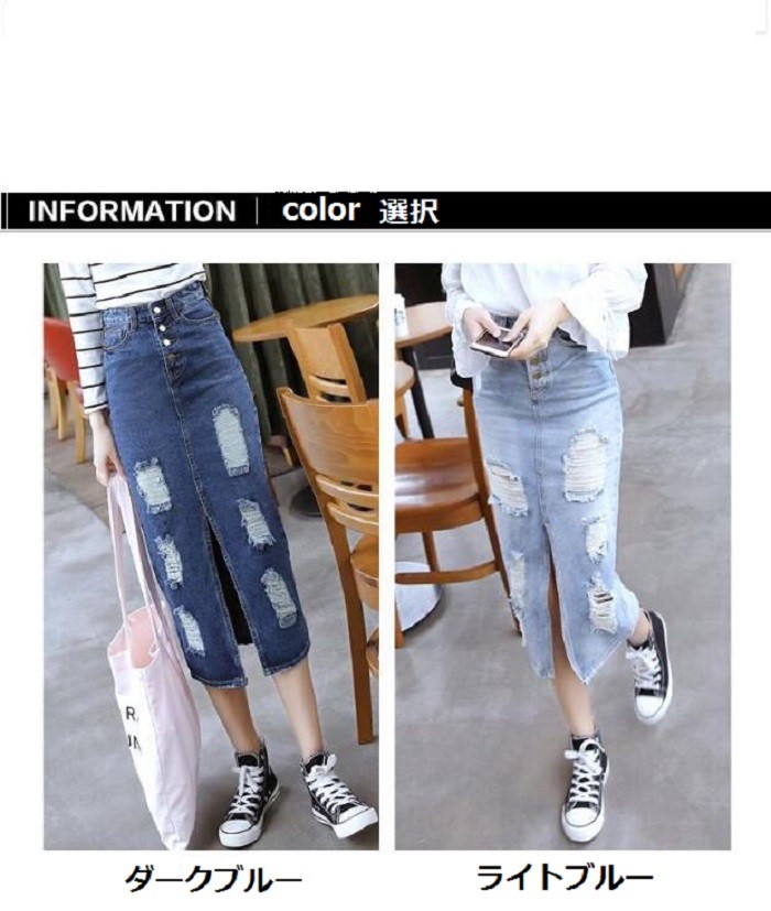 レディース ダメージ デニム スカート クラッシュ タイト ひざ下 ロング カジュアル ボトムス 美ライン