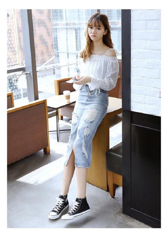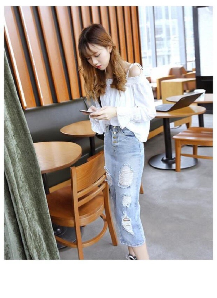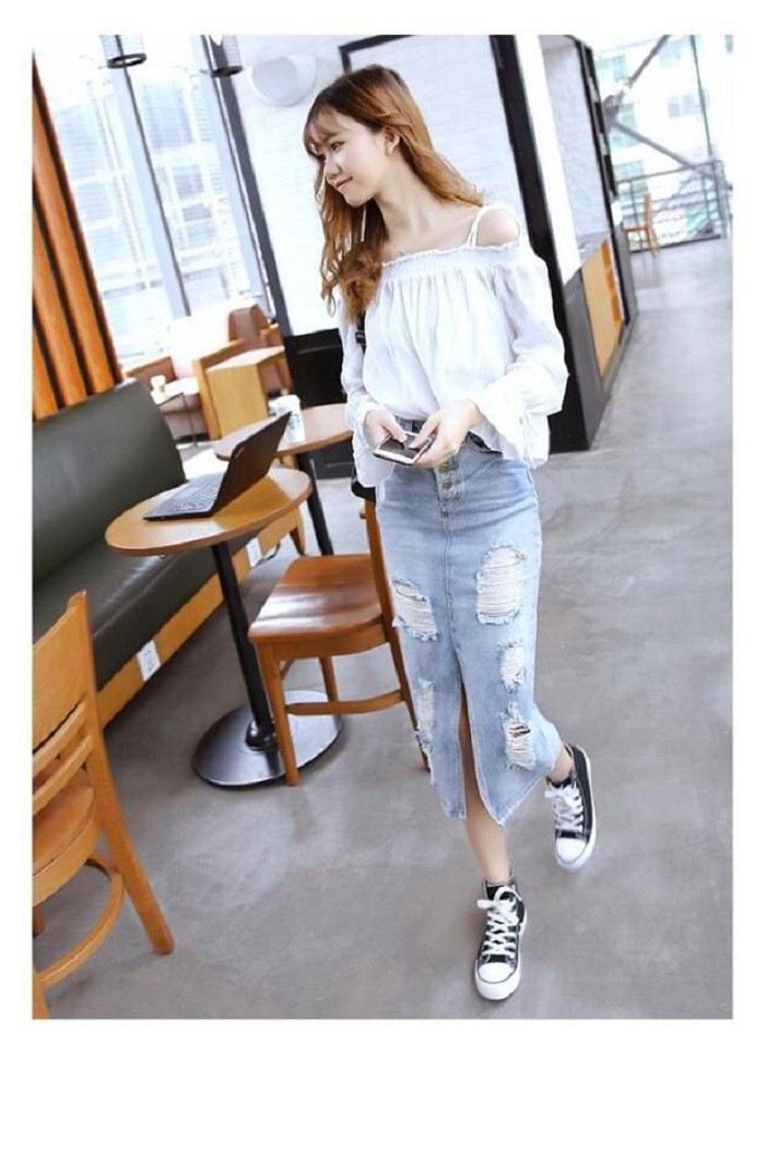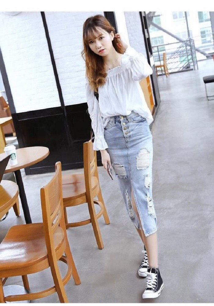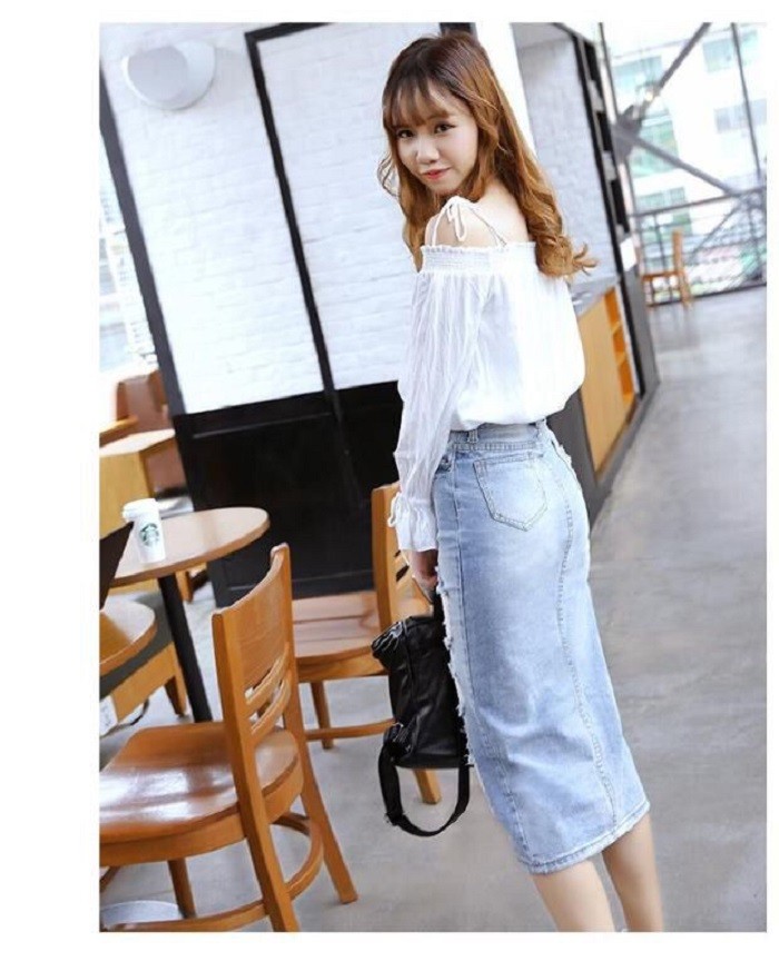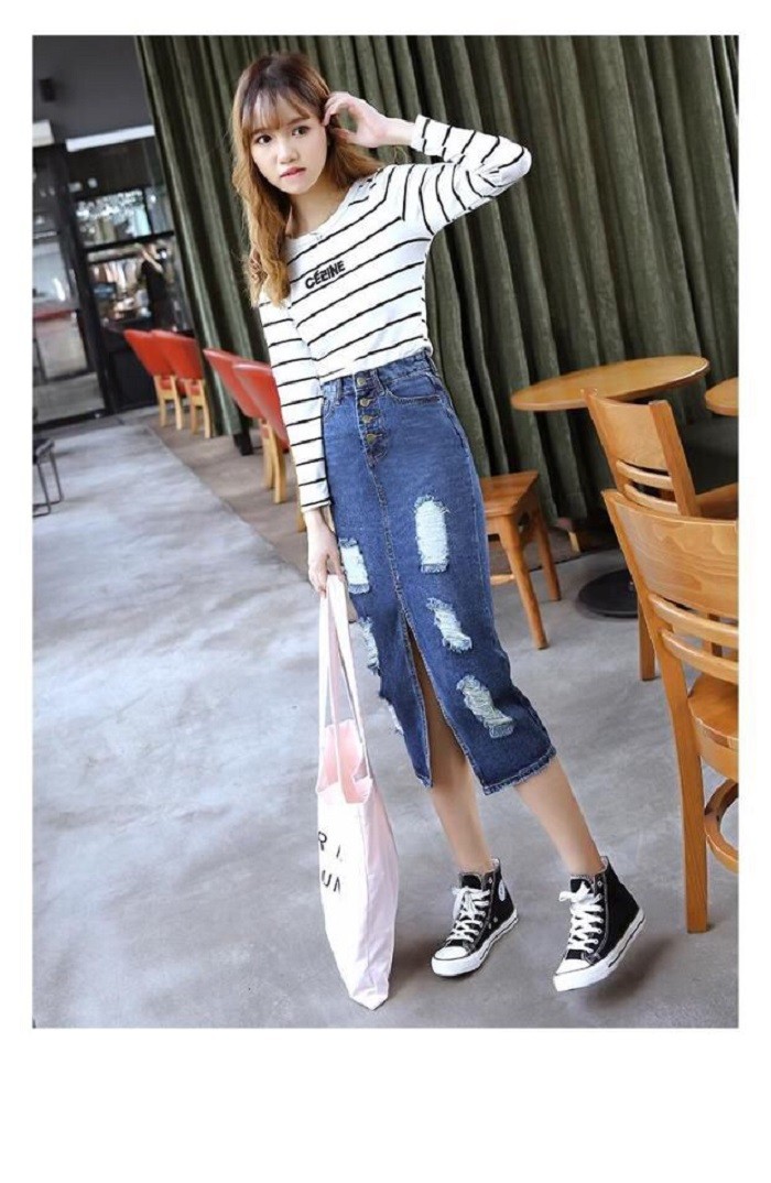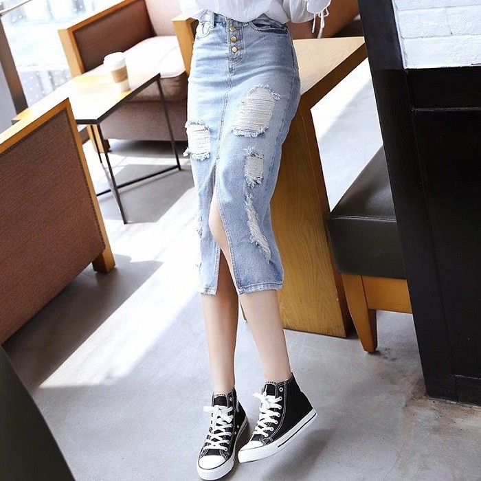 レディース ダメージ デニム スカート クラッシュ タイト ひざ下 ロング カジュアル ボトムス 美ライン