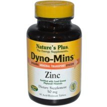Studio : Nature's Plus Publisher : Nature's Plus Binding : Health and Beauty Product Description Dyno-Mins Zinc 50mg 90 TabletProduct Description Health experts agree that dietary minerals play a critical role in the health of every organ of the body. But even a well-rounded diet can leave our bodies deficient in essential minerals. Nature's Plus took the scientifically proven, highly bioavailable line of DYNO-MINS mineral supplements and dramatically improved it with the most cutting-edge natural ingredient technologies, developed from the latest research on mineral absorption and utilization. The original DYNO-MINS line employed a broad spectrum of powerful organic carriers, each chosen for its unique ability to transport essential minerals to specific tissues. Now, complementing the popular and proven DYNO-MINS formula are Phytavail food grown minerals, delivering plant-based minerals with phytonutrient cofactors for better absorption and utilization, Rare Earth Elements, for more complete mineral nutrition and FOS, for even greater mineral absorption. Supplement FactsAmount Per Serving% Daily Value***Nature's Plus took the scientifically proven, highly bioavailable line of DYNO-MINS mineral supplements and dramatically improved it with the most cutting-edge natural ingredient technologies, developed from the latest research on mineral absorption and utilization. The original DYNO-MINS line employed a broad spectrum of powerful organic carriers, each chosen for its unique ability to transport essential minerals to specific tissues. Now, complementing the popular and proven DYNO-MINS formula are Phytavail food grown minerals, delivering plant-based minerals with phytonutrient cofactors for better absorption and utilization, Rare Earth Elements, for more complete mineral nutrition and FOS, for even greater mineral absorption.50 mg333 % *Daily Value Not Established ***Percent Daily Values are based on a 2,000 calorie diet
