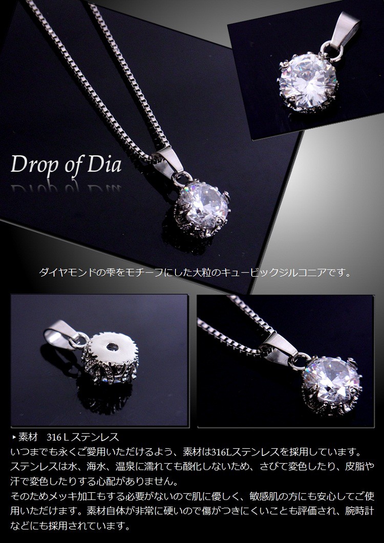ドロップオブキュービックジルコニア大粒のキュービックジルコニアがキラキラと輝くペンダントトップです。バチカンを含む縦27mm×幅15mm×厚み9mmバチカン直径4mmCZダイヤ(キュービックジルコニア)は人口石です。ダイヤモンドに負けない美しさを持ち、視線を引き込み、潤いをも感じさせる美しい輝きです。■素材:サージカルステンレス肌に優しく、敏感肌の方にもお勧めの素材です。皮脂や汗、水、海水、温泉などで濡れてもほとんど変色せず、傷にも強いことから、腕時計の素材としてもよく使われています。