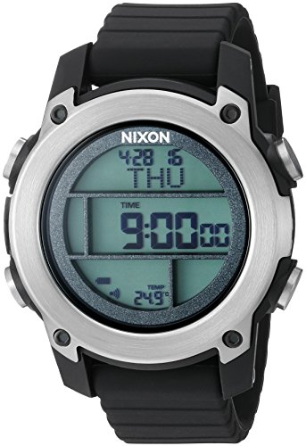 The Unit Dive watch is a true in-the-water companion from Nixon®. Custom digital with LCD display in either positive or negative high contrast. Functions: • In dive mode the LCD displays total dive time, maximum depth, actual depth, maximum and minimum temperature, and fast ascent warning.• The dive log stores your past 50 dives for easy reference and can accommodate both Imperial and Metric units of measure. • Basic time functions include dual time, time of day (12 hour or 24 hour), day/date, auto calendar through 2099, chronograph with 1/100 second resolution and lap counter up to 99 laps, timer with 3 functions (count-up, count-down, and count-down repeat), 3 independent alarms that can be assigned to separate time zones.• The movement also includes an EL backlight, battery level indicator, optional key tone and hourly chime, and current temperature display. Case:• 100 meter/10atm• Custom molded polycarbonate case in matte finish• Solid Stainless steel bezel with integrated pusher guards• Domed hardened mineral crystal• Four custom molded stainless steel pushers• Stainless steel screw-on caseback• Secured with solid stainless steel screw pins Custom molded silicone band with soft touch feel and ultra comfort, patented locking looper, and custom molded polycarbonate buckle with stainless steel screw bars. Imported. Measurements: Case Height: 45 mm Case Width: 50 mm Case Depth: 16 mm Band Width: 4⁄5 in Band Circumference/Length: 7 in Weight: 3.2 oz This product may have a manufacturer's warranty. Please visit the manufacturer's website or contact us at warranty@support.zappos.com for full manufacturer warranty details.Feature