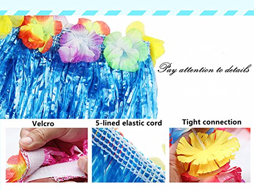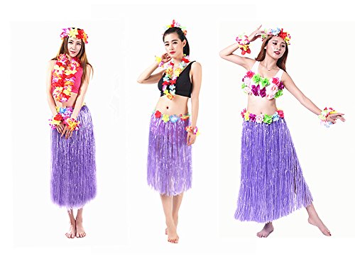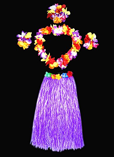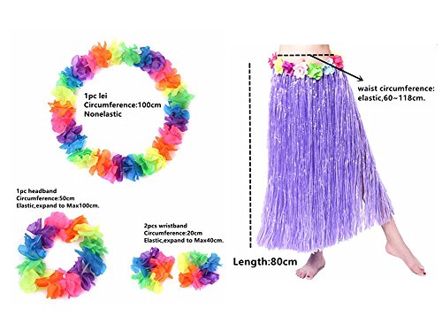- PACKAGE INCLUDES-1pc hula skirt,1pc headband,1pc lei,2pcs wristband.Skirt color:purple,others' colors:multicolor.Weight:about 300g.