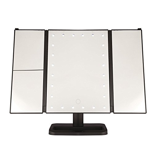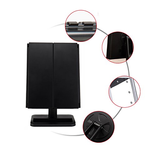 - ✅LIGHTING DESIGN: The 24 LEDS are now installed within the two side light bars, instead of the visibly dazzling LEDs situated on the peripherals of the tri-fold mirror. This provides you with a clear reflection without dazzling your eyes.