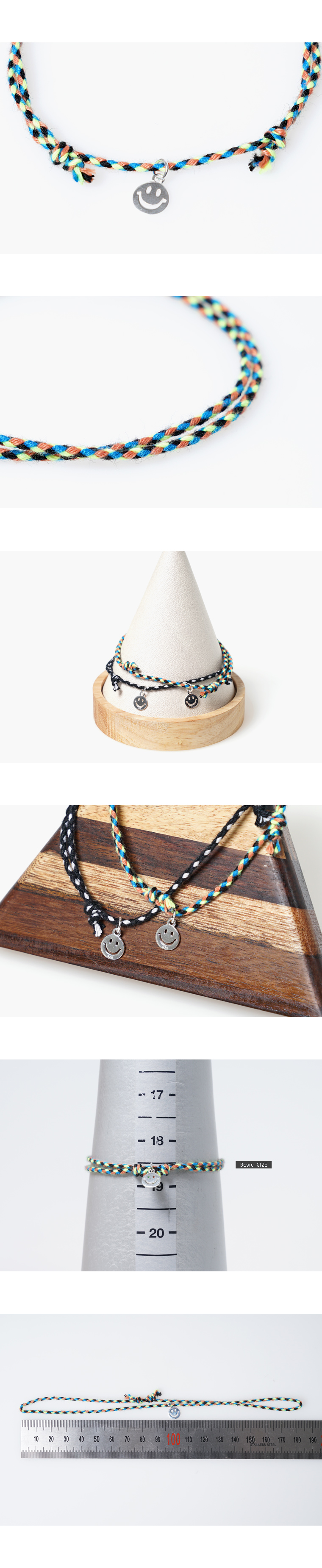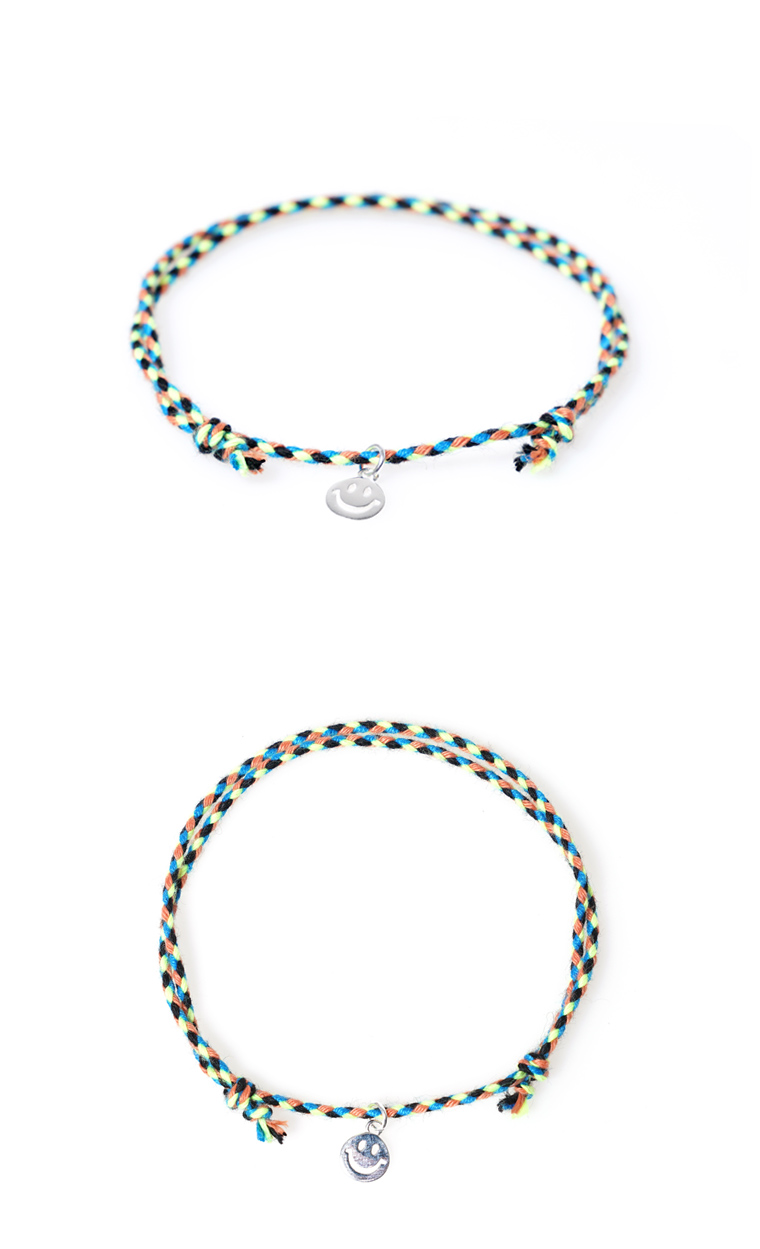 컬러감 좋은 스트링을 이용해서 제작된 발찌입니다. 매듭방식으로 제작되어 사이즈 조절이 가능하도록 제작되었으며, 은으로 제작된 귀여운 스마일 팬턴트가 포인트로 매력적인 발찌입니다. 여름철 물놀이 등 야외 활동이 많은 계절에 착용이 편하고 은을 사용해 일반도금재료로 인한 알러지 걱정이 없도록 제작했습니다. 남녀공용으로 착용하기 좋은 디자인으로 커플발찌로 착용하기 좋도록 남성용, 여성용, 맞춤제작 사이즈로 제작되며 추가 비용은 없습니다.