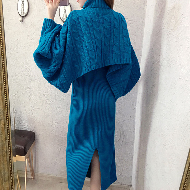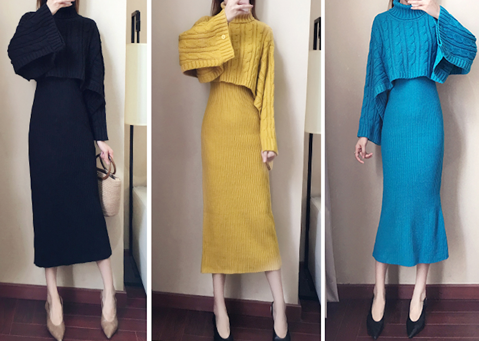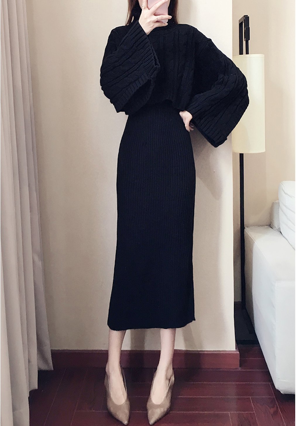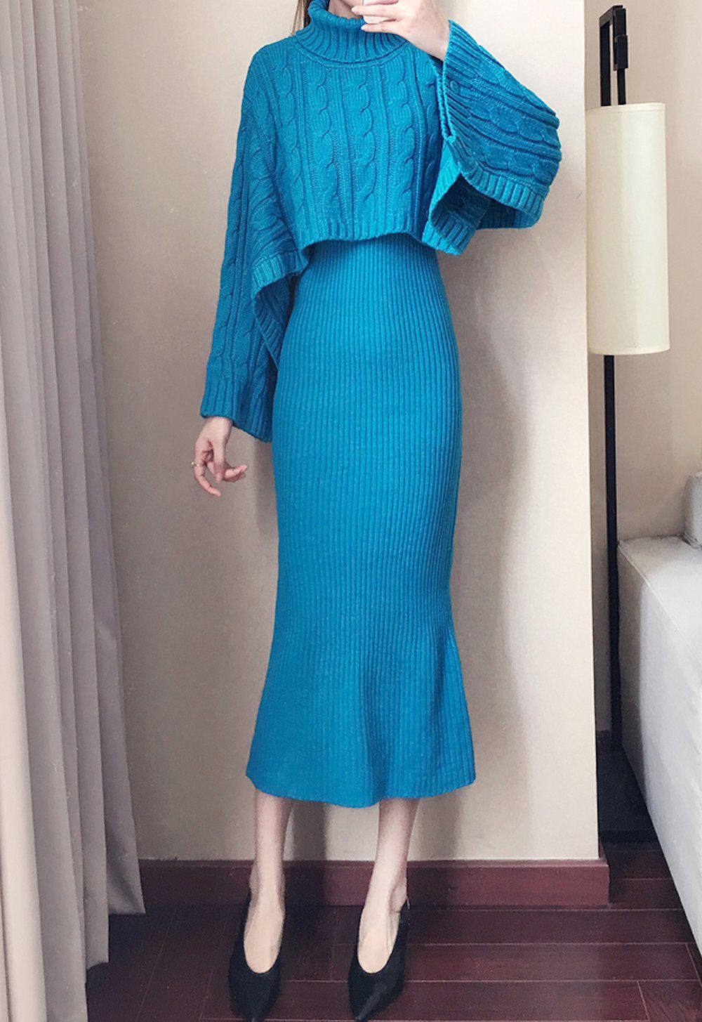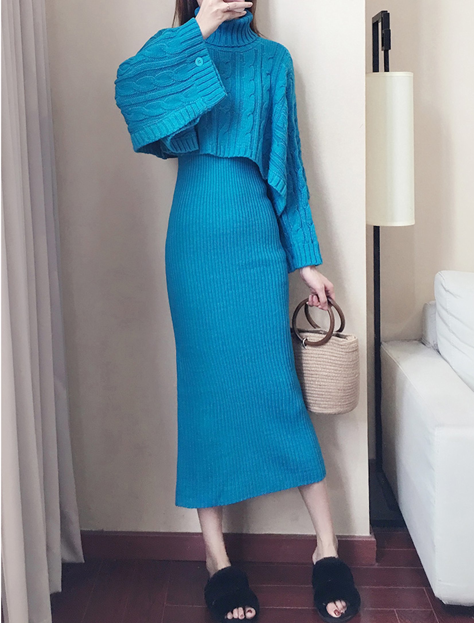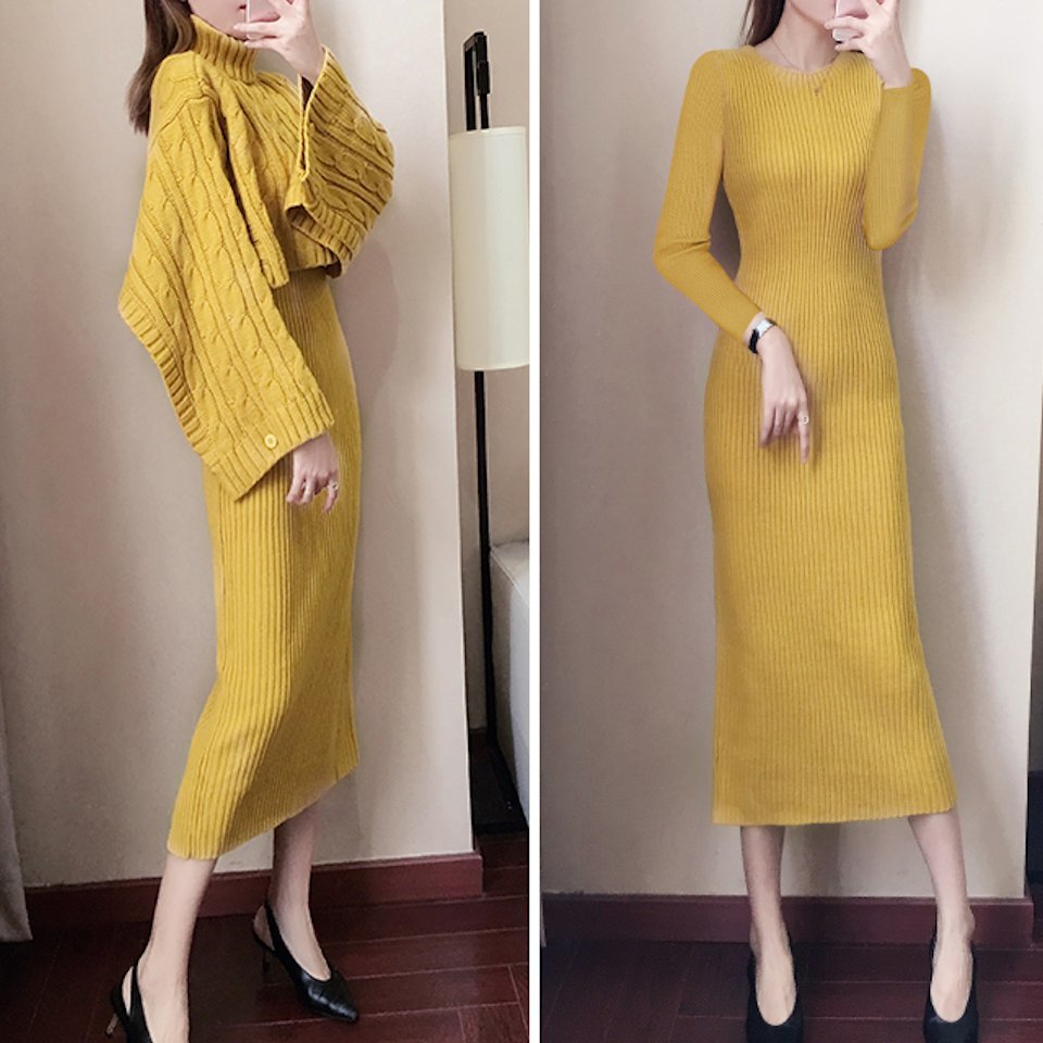 ケーブル編みショート丈のタートルニットとリブタイトワンピースのセットアップ。