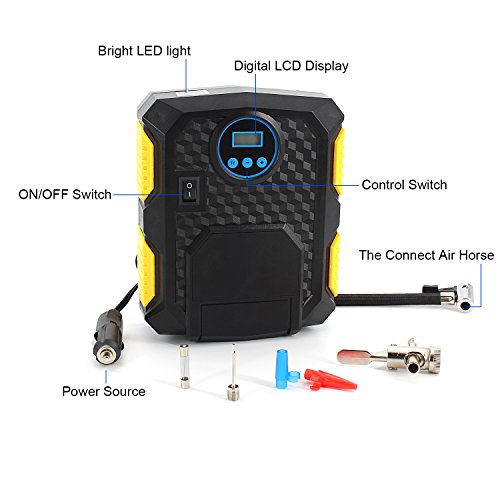 High Efficiency: Digital Display Car Air pump comes with brass coarse coil that makes it safe, stable, noiseless and durable.Its maximum air flow is 35L/min, can fully inflate each wheel within 2 minutes and automatically shuts off when the set psi is reached