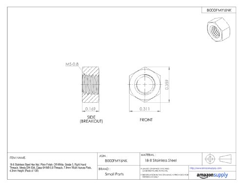 Metric DIN 934 Plain 18-8 Stainless Steel Hex Nut, M5-0.8 Thread Size, 8 mm Width Across Flats, 4 mm Thick (Pack of 100)