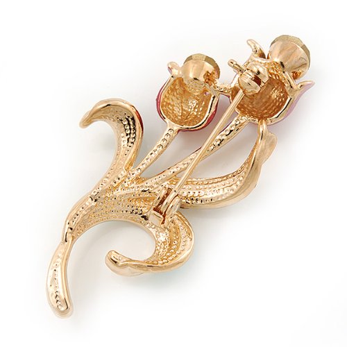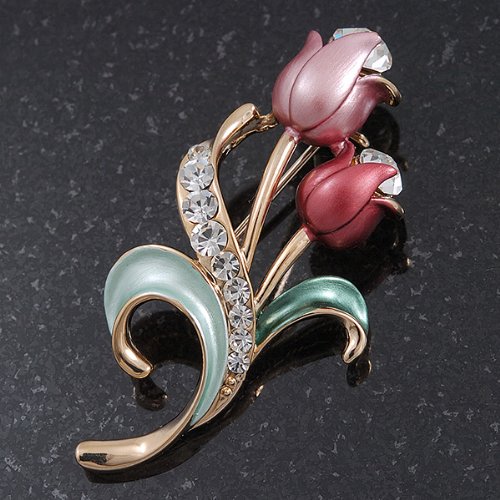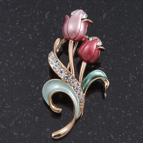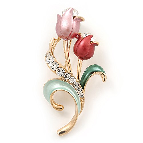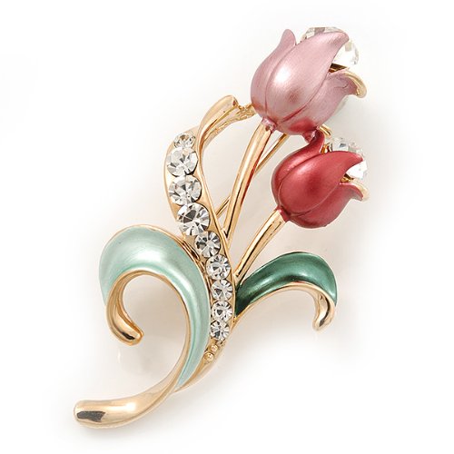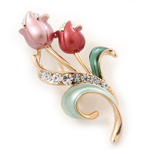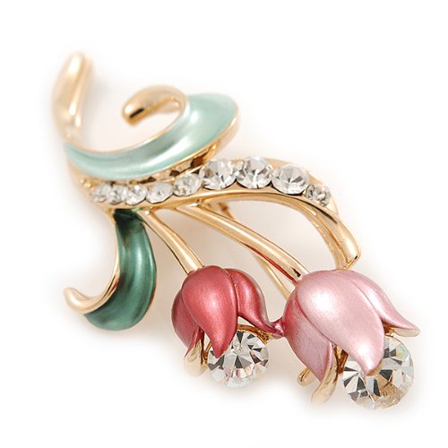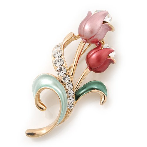 Sweeten your style with this charming Pink Enamel Diamante 'Tulip' Brooch In Gold Finish. Featuring a floral design in the shape of two tulips, crafted in polished gold plated metal and encrusted with clear crystals on a leaf. The tulips covered with enamel detailing in hues or pale and deep pink and garnished with a single clear crystal for a dash of sparkle.. The brooch measures about 5cm x 2.5cm and fastens with a flag pin and revolver.Feature