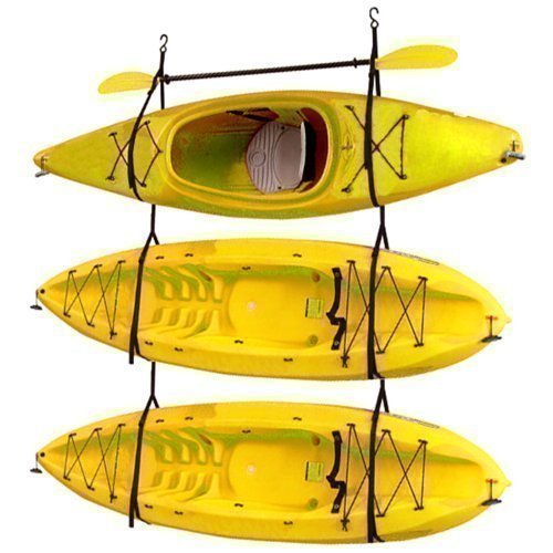 The Gear Up Hang-3 kayak storage strap system is a simple and easy way to store your kayaks up off the ground and out of the way.  The storage straps are adjustable and also include quick-release buckles as well for easy loading and unloading.  Use indoors or outdoors.  Stainless steel heavy-duty eye bolts are included for you to mount into the ceiling or wall.  135lb weight capacity.