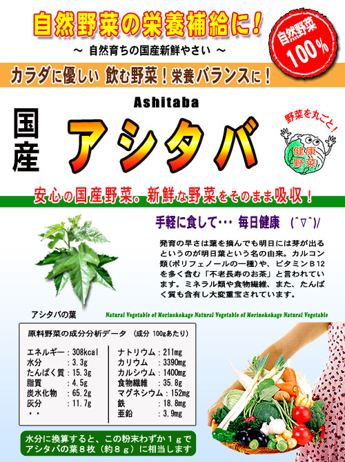 アシタバ特有のカルコンという成分は、最近たいへん注目されています^^ ・・商品特徴・・・・ 過剰なカロリー摂取や運動不足、偏食などの生活習慣の乱れた現代人にとって、 カルコンは大いなる可能性を秘めた期待の有力成分といえるでしょう。 食事制限や運動を推奨されている方、生活習慣の乱れを改善しようとする方にとくにおすすめです☆ 国産の健康野菜を自然のまま丸ごと加工していますので、小さなお子様からお年寄りの方まで安心してご愛用頂けます。 普段の野菜不足を解消できますので、毎日のお食事の時など、健康のためにご家族の皆さまで、どうぞお召し上がりください。 ・・その他・・・・・・ 保存方法:開封前 直射日光、高温多湿を避ける開封後密封、低湿度 | | | 粉末の状態 |  | | 主な原産地:徳島県 | ・・有効成分・・・ カルコン・ビタミンB12・イソクエルチトリン・葉緑素・アンゲリカ酸 ・・使用部位・・・ 葉 ・・原産国・・・・ 国産 | |