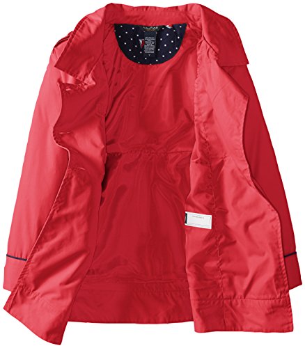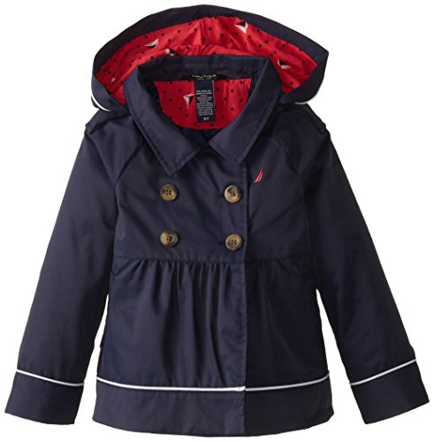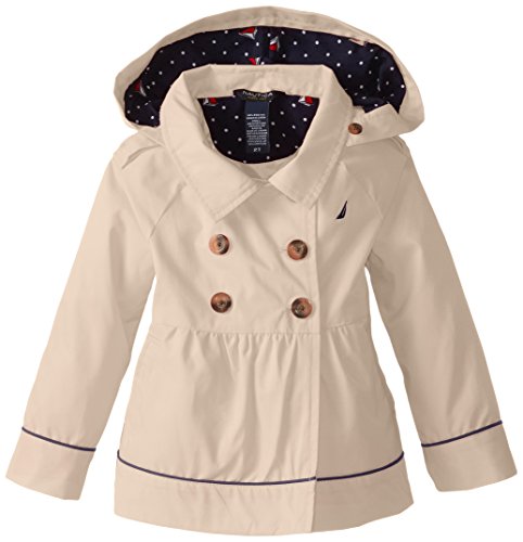 Classic double-breasted trench coat featuring piped trim and detachable hood with polka-dot lining