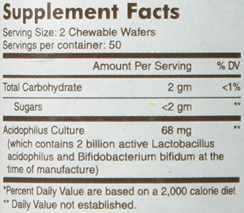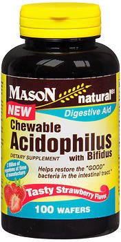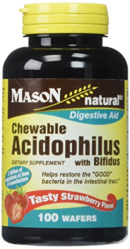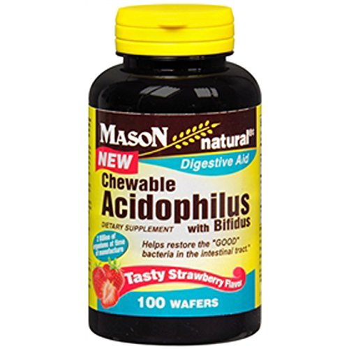 Studio : MASON VITAMINS INC Publisher : MASON VITAMINS INC Binding : Health and Beauty Product Description Chewable acidophilus contains lactobacillus acidophilus and bifidus 2 strains of probiotic bacteria (sometimes called "friendly flora") necessary for proper digestion. Probiotics support colon health and restore the bacteria that normally reside in the intestinal tract. Probiotic bacteria are also beneficial for a strong immune system and improved digestive health.* This product is allergen free. Guaranteed no added: yeast, soy, wheat, gluten, egg, fragrance, artificial color and preservatives. *These statements have not been evaluated by the Food and Drug Administration. This product is not intended to diagnose, treat, cure or prevent any disease.Directions: As a dietary supplement, chew 1 to 2 wafers two to four times daily, preferably with milk, or as directed by a healthcare professional. Store in a dry, controlled room environment.Ingredients: 2 Chewable Wafers: Calories 6; Total Carbohydrates 2 g (Sugars 2); Lactobacillus Acidophilus 180 mg; Lactobacillus Bifidus 50 mg (Contains 2 Billion Organisms at Time of Manufacture); Microcrystalline Cellulose; Stearic Acid; Strawberry Flavor; Magnesium Stearate; Citric Acid; Silica 0