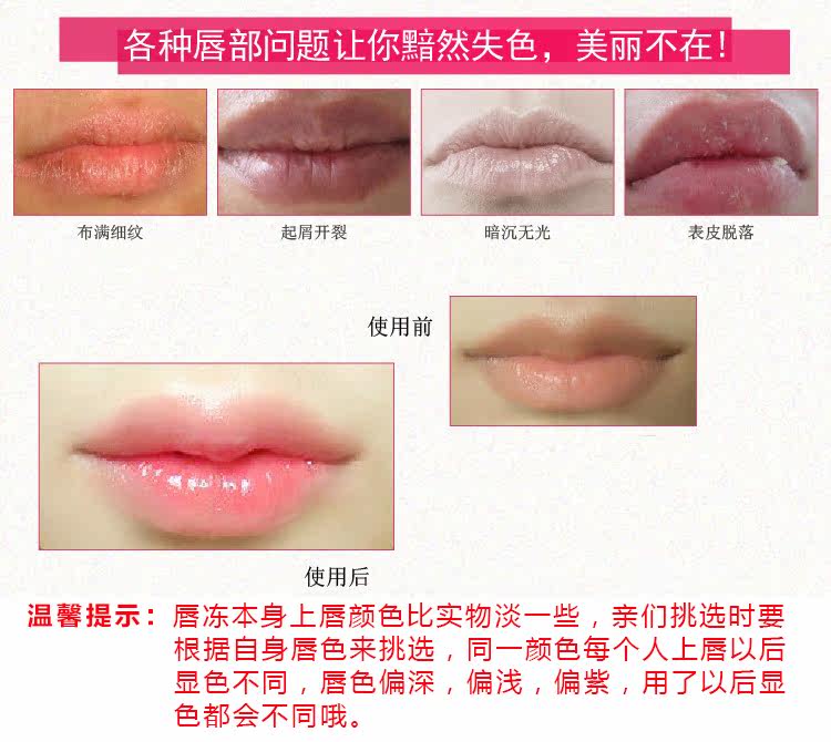 1、唇冻上唇的颜色比较淡,裸色上唇就是无色!本店不接受,亲们自己选择了裸色,说不上色没颜色而给的中差评!裸色上唇本来就是无色!请个别买家不要无理取闹!
