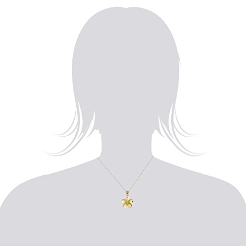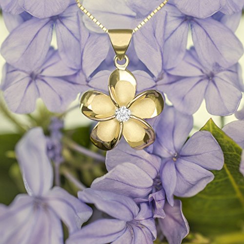 A silver plumeria necklace with yellow gold finish. Flower has a smooth sandblast finish and high polished petal edges. Comes with a 16"-18" adjustable box chain. Gift box included. From Honolulu Jewelry Company, Honolulu, Hawaii.Feature