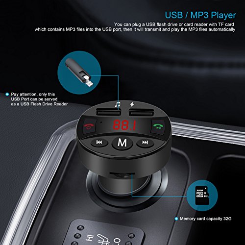 Using U-disk and TF Card Function 1)Plug the FM transmitter into your vehicle's cigarette lighter. 2)Tune the car FM radio frequency to a blank FM station. Then tune the FM transmitter into the same frequency with the car FM radio. 3)Insert the TF card/U-disk into the device, it will automatically detect and play the MP3 format music in the TF card/U-disk. 4)Music selection: Press the button Previous and Next to select your favorite song.