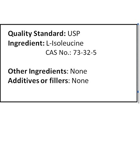 -. Feature : L-Isoleucine Pure Powder 227g (8 oz), complies with US Pharmacopeia (USP) quality standard. / There is not any additive or filler inside. Assay ≥ 99%. / White crystalline powder, slightly bitter taste, sparingly soluble in water. Store in cool and dry place, keep away from strong light and heat. / New, pure and fresh, 1 to 1.5 years shelf life available. / Pure ingredient for consumption, formulation, food additive, health product R&D (research and development), or any other proper purpose.