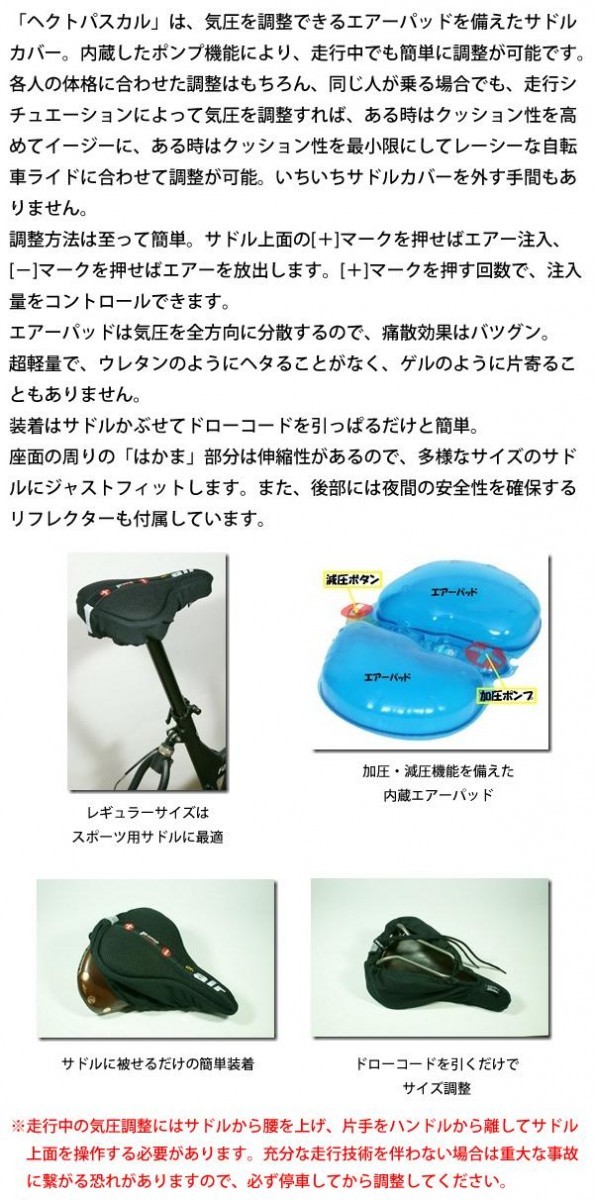 | 仕様 | 適合サドル:スポーツタイプサドル パッド:調圧機能付シングルエアーパッド クッション調整可能 水洗い可能 反射テープ付き 保証期間:1年 |