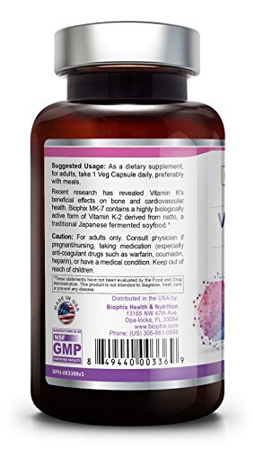 The premium Vitamin K2 menaquinone7 (MK7), used in this formula is derived from Natto, a fermented soybean food used since ancient times in Japan. Biophix MK7 contains a highly biologically active form of Vitamin K2 derived from nonGMO Natto. Recent research has revealed Vitamin K's supportive effects on healthy bones and arterial health.Feature