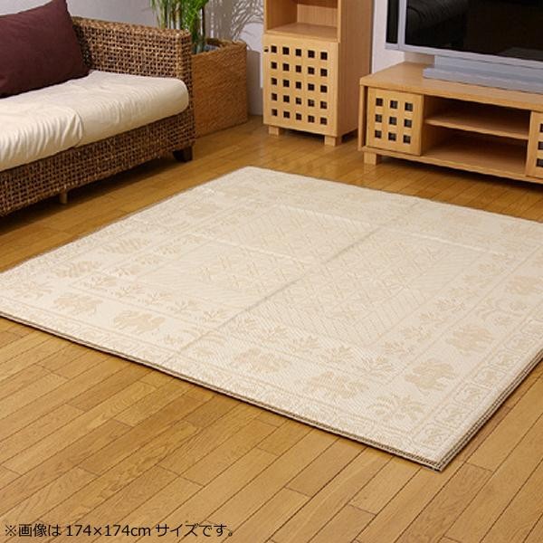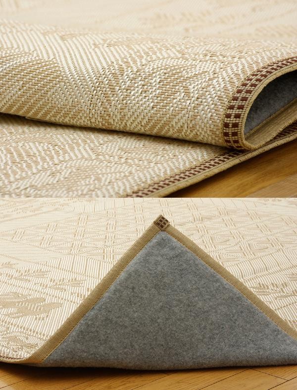 麻の一種であるジュート糸と、ポリエチレン糸のジャガード織のカーペットです。裏面にはフローリングを傷つけにくいよう不織布を貼っています。また、中材にはウレタンを使用しているのでクッション性があります。 |