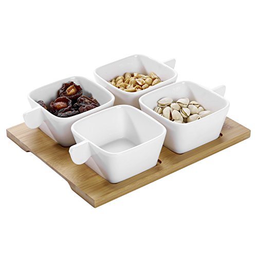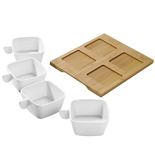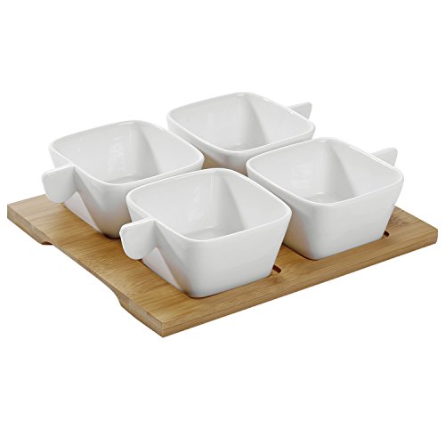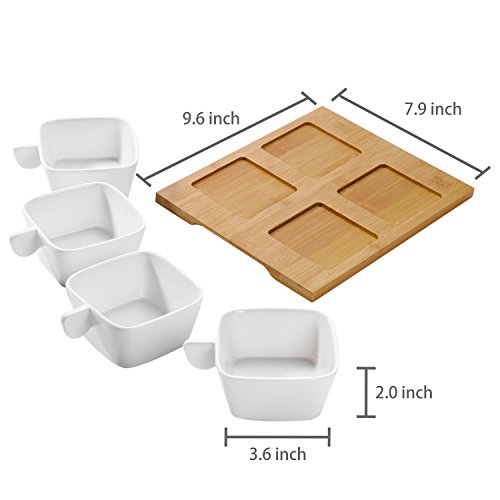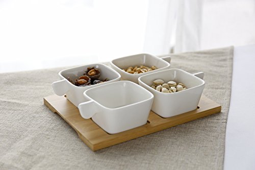 Featuring a modern square design and distinctive solid handles, this set of 4 snack bowls and bamboo serving tray offers a stylish way to serve snacks with cocktails, condiments with meals, or toppings for desserts. The 3.6-inch bowls are perfectly sized for finger foods such as nuts, dried fruit, or olives, as well as dips, salsas, sauces, and chutneys. This versatile set can also be used for taco fixings, pizza toppings, or ice cream toppings. Ideal for giving snacks or meals a more elegant presentation, this sleek ceramic and bamboo serving set is an essential accessory for stylish entertaining.Approximate Dimensions (in inches): Overall - 2.4 H x 9.6 W x 7.9 L; Each Bowl - 2 H x 3.6 W x 3.6 L; Tray - 9.6 L x 9.6 W.