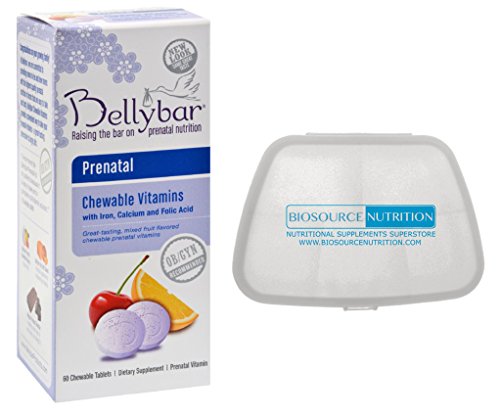 Bellybar Prenatal 60 Chewable Tablets in Bundle with Biosource Nutrition Pocket Pill Pack. Bellybar Prenatal Chewable Vitamins with Iron Calcium and Folic Acid are a convenient way to take your prenatal vitamins. A tasty alternative to large pills, Bellybar Prenatal Vitamins contain no artificial colors, flavors or preservatives. These mixed fruit-flavored chewable Belly Bar Vitamins are gluten free and OB/GYN recommended. Bellybar Prenatal Chewable Vitamins with Iron Calcium and Folic Acid are available in a 60-count bottle. Biosource Nutrition Pocket Pill Pack (5 compartments)Feature