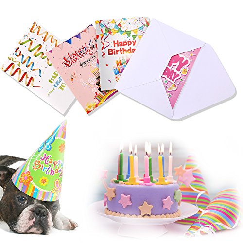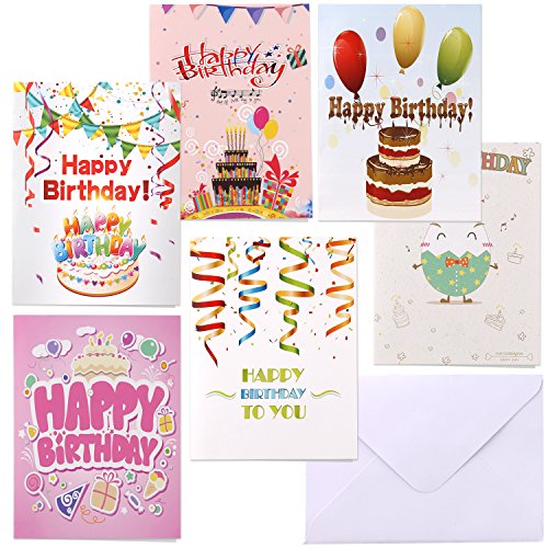 BIRTHDAY CARDS BOX SET: 48 pack of Happy Birthday greeting cards in 6 colorful photos of birthday party supplies and elements.