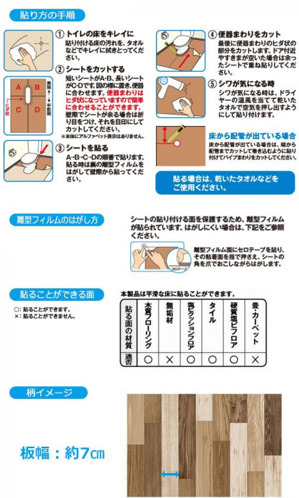 | トイレの床の表面を、汚れやキズから守りたい!!そんな願いから生まれた商品です。のりを使用しておりませんので、簡単に貼ってキレイにはがせます。貼りやすいようにシートを4分割してあります。防水ですので、濡れてもサッと拭きとるだけでお手入れラクチン♪ |