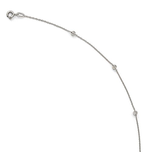 -. Binding : Jewelry -. Brand : The Black Bow -. Color : White -. Department : womens -. Feature : Polished & d/c 14k white gold design / Approximate width 3mm / Adjustable 9 to 10 inch length / Weight is Approximately 1.41 grams / Includes our custom gift box -. Label : The Black Bow -. Manufacturer : The Black Bow -. Model : A8675 -. MPN : A8675 -. NumberOfItems : 1 -. PackageQuantity : 1 -. PartNumber : A8675 -. ProductGroup : Jewelry -. ProductTypeName : FINENECKLACEBRACELETANKLET -. Publisher : The Black Bow -. Studio : The Black Bow -. Title : Black Bow Jewelry 14k White Gold Diamond-Cut Beaded Cable Chain Anklet, 10-11 Inch