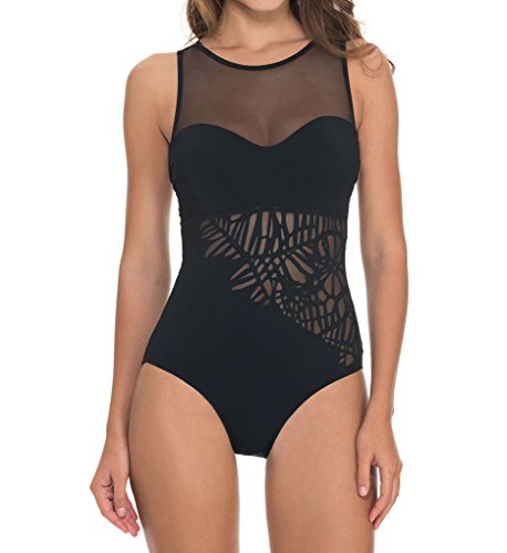 Rainforest high neck one piece swimsuit updates a classic silhouette with cut out, mesh detailing.