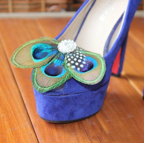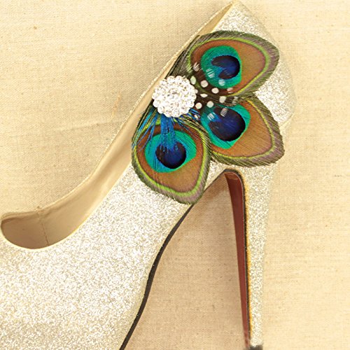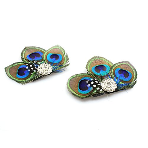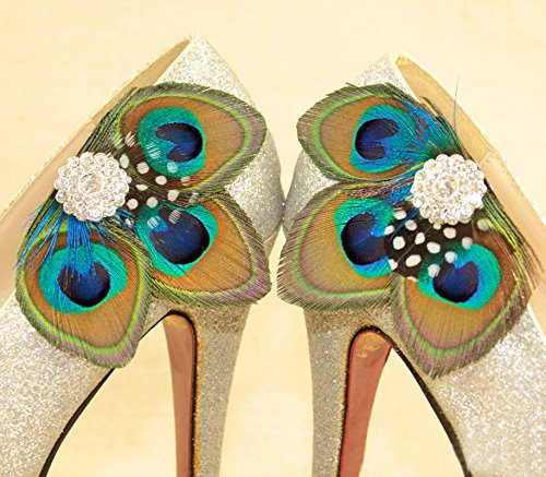 100% handmade gorgeous Peacock feather Shoe clips This listing is for one pair of exotic and unique handmade peacock feather shoe clip accessories. Made of selected natural shed peacock feathers,polka dot feather and embellished with a super sparkling rhinestone.