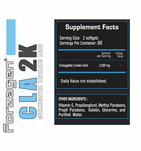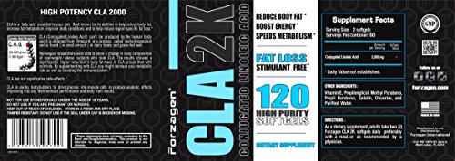 -. Feature : Well-designed clinical trials sest that CLA may reduce body fat mass.* Together with a balanced diet and regular exercise, Forzagen CLA 2000 is a great, non-stimulating addition to your overall weight-loss plan. / Conjugated Linoleic Acid is a slightly altered form of linoleic acid, an Omega-6 fatty acid important to human health. / The leading brand of CLA. Industry-best products developed by our on-staff physician and backed by our knowledgeable customer support professionals have made Forzagen's CLA 2000 a best-selling weight management supplement. / Certified quality and purity. Forzagen's CLA 2K is manufactured in the USA in an NSF/GMP certified facility, assuring you that your purchase meets strict standards for ingredient quality and safety. All natural, non-stimulating, and gluten-free. / Responsive customer support. Our unsurpassed service professionals are available to answer any questions you may have.