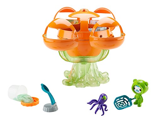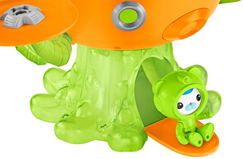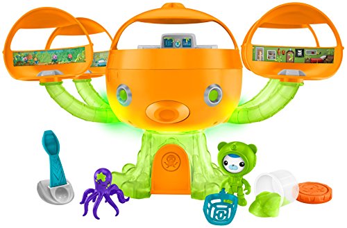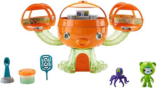It's slime time! The Octonauts find themselves in a sticky situation when the Octopod becomes mysteriously covered in slime! Press the Octopod's mouth to see its translucent tentacles light up and glow a cool slime-green color and to hear phrases from the crew. Make a quick exit out of the Octopod using the Octo-hatch in the Launch Bay or search the Octopod for the missing octopus-could he be hiding in Barnacles' or Kwazii's quarters or maybe he's escaped to the Garden Pod? The Sea-Slimed Octopod Playset comes with Barnacles in his slime-green Octo-suit, a rescue net, a slimed octopus, a slime catapult and a container of extra gooey slime! On the television show the Octonauts' missions take place in the water, but this Octopod toy needs to stay on land as it is not intended for water play.Feature