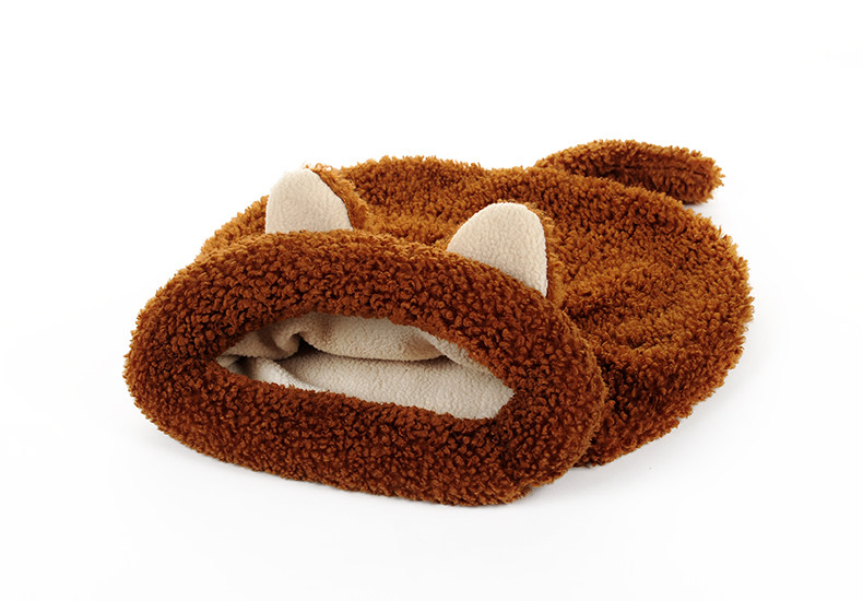给人感觉绒绒的,暖暖的,外部是卷曲绒,生动可爱,内部是淡米色的羊羔绒,厚实不掉毛。睡袋的款式更容易汇集热量,睡在里面会感觉更暖和哦!而且对于幼犬幼猫,还有胆子小的宝贝们来说这样的款式有安全感,舒服的蜷缩在里面享受了。