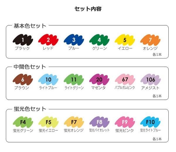 | セット内容 | 【基本色セット】 ♯1(ブラック)、♯2(レッド)、♯3(ブルー)、♯4(グリーン)、♯5(イエロー)、♯7(オレンジ) 各1本 【中間色セット】 ♯6(ブラウン)、♯10(ライトブルー)、♯11(ライトグリーン)、♯20(マジェンタ)、♯67(バブルガムピンク)、♯106(アメジスト) 各1本 【蛍光色セット】 ♯F4(蛍光グリーン)、♯F5(蛍光イエロー)、♯F7(蛍光オレンジ)、♯F8(蛍光バイオレット)、♯F9(蛍光ピンク)、♯F10(蛍光ブルー) 各1本 |