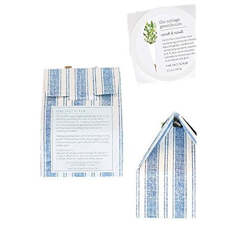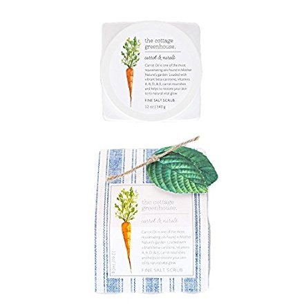 Sea Salt Body Scrub: Carrot Oil is one of the most rejuvenating oils found in Mother Nature's garden. Loaded with vibrant beta-carotene, Vitamins A, B, D, and E, carrot nourishes and helps to heal dry, chapped, or cracked skin. Mother Nature Knows Best: Our good-for-you, veggie packed, spa-to-go scrub! Naturally nourishing Avocado Oil and cheery Carrot Oil (known for its ability to visibly improve skin tone and improve general skin health) blend with luscious Cocoa Butter to create a skin softening sensation! Small granule Sea Salt combined with the polishing power of Adzuki Bean sloughs away sluggish surface cells to reveal your super smooth skin for a happy, radiant glow. Made With: Avocado Oil, Carrot Oil & Cocoa Butter. Good to Know: Paraben Free/ Gluten Free/ Never Animal Tested/ Vegan Dimensions: BOX: 4.75" H 3.75" W CONTAINER: 3.5" x 3.5" square container - circle Lid 3.5" D Fill Weight: 12 oz / 340 g
