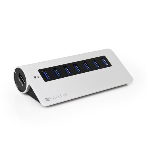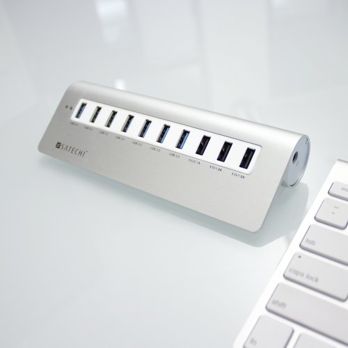 The Satechi 10-Port Premium Aluminum USB 3.0 Hub adds 7 more USB ports to your computer to connect 7 USB devices for accessing, as well as 3 charging ports to provide power to your smartphone, tablet, and other mobile devices. This allows you to connect and use USB devices such as digital cameras, external hard drives, flash drives, and printers, all from a single hub. Powered by USB 3.0, this hub provides quick data rates of up to 5.0Gbps. Equipped with a power supply, the Satechi 10-Port Premium Aluminum USB 3.0 Hub guarantees electric current stability and the effective operation of connected USB devices. It does not require any software, drivers, or complicated installation process. The Satechi 10-Port USB 3.0 Hub features a sleek design to fit on your desk without taking up precious desktop space.Charging Ports