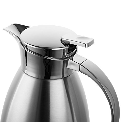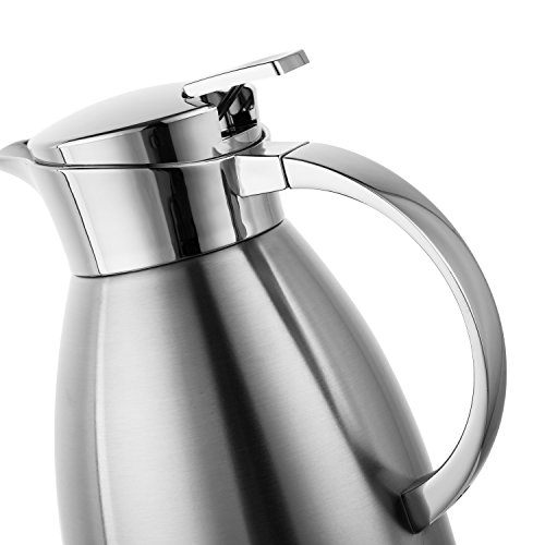 Hiware Carafe keeps hot beverages hot and cold beverages cold, so this is the way to serve hot coffee or tea, even your favorite cold beverages. With an elegant and decent appearance, the coffee pot is a piece of artwork for decorating your kitchen and table. This carafe features a convenient, press button top. It has a stainless steel liner and a vacuum chamber that keeps drinks hot or cold, longer. Carafe made of durable stainless steel; it will not stain or retain unpleasant tastes or odors. 64-ounce capacity. Stainless steel finish.