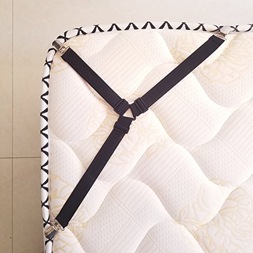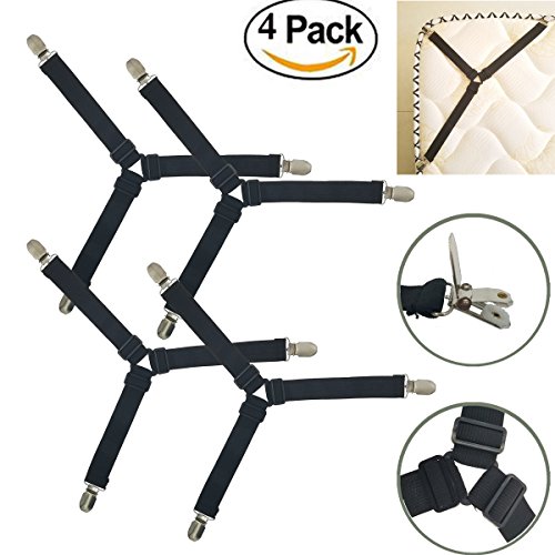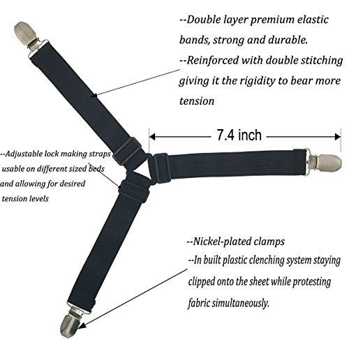 Product Description About the product - Our Sheet Fasteners is built in plastic clenching system protects fabric from harm. - Sheet suspenders are built with durable round elastic, nickel plated clamps with fabric protector and unique heavy duty bungee cord lock. - It's easy to put on and keeps sheets in place and no more fixing sheets, adjustable length allows desired tension. - These bed sheet straps fit to fitted or flat sheets on different type of beds such as standard size, odd shaped beds, foam beds, pillow top beds, air mattresses, RV's and travel trailers and more. - Use cover fasteners and never worry about messy or wrinkled sheets again, eliminate the slipping of any bed sheets with these sheet fasteners. - Other uses: tablecloths covers, grill covers, cars seat cover, boats seat cover, motorcycle seat cover, scooters seat cover, couch seat cover, chairs seat cover and more. Include Set of 4 bed sheet grippers suspenders straps clips 0