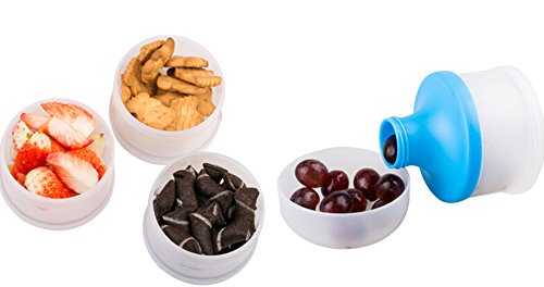 -. Feature : Four-chamber dispenser holds powdered formula for up to four feedings, separate compartments so contents do not mix. A hygienic storage solution when your baby is on the go. / Screw in the top dispenser lid to any containers and instantly use it as formula dispenser. Cap lifts open and swivels, staying out of the way while pouring. Rotating cap prevents powder spilling into other compartment shells. / Food grade polypropylene material, SGS Tested and BPA free, dishwasher-safe, microwavable, and suitable for sterilizing. / Four stackable containers set, full 9 ounces of powdered formula or 2.3oz of dry goods fit in each compartment. Compact size fits easily in diaper bags, lage or purses. / Nanotech finished interior, smooth surface, leave no residue and easy to clean.