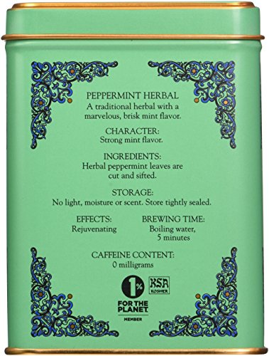 -. Feature : 20 Sachets in a tin / Each sachet brews a 12oz cup of tea / Caffeine free - herbal / Our 20ct tin of Peppermint is Kosher / Brewing Time: 5 minutes Brewing Temperature: 212° F