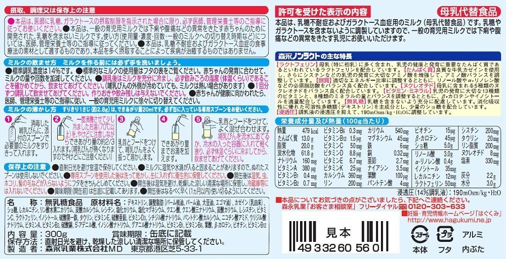 35 mg, pantothenic acid: 4 mg, β-carotene: 45 μg, lactoferrin: 50 mg, cystine: 200 mg, taurine: 20 mg, phospholipid: 200 mg, nucleotide: 360 mg, calcium: 360 mg, phosphorus: 200 mg, potassium: 540 mg, chlorine: 330 mg,